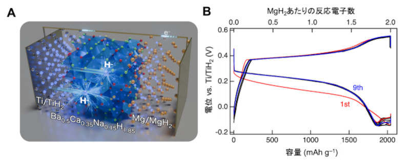 (A)全固体電池の模式図 (B) 全固体電池の充放電曲線。放電反応は MgH2の脱水素化、充電反応は Mg の水素化反応に対応する。