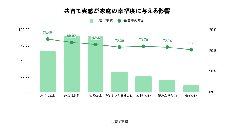 「共育て」とは、配偶者やパートナー、祖父母など複数の大人が協力して子育てを行うことを指す。今回の調査によると、「共育て実感がとてもある」と回答した家庭の幸福度は85.4ポイントであったのに対し、「全くない」と回答した家庭は68.2ポイントにとどまり、約17ポイントの差が見られた。なお、幸福度は、武蔵野大学・前野隆司教授の「幸せの4因子」(※)を基準として算出された。