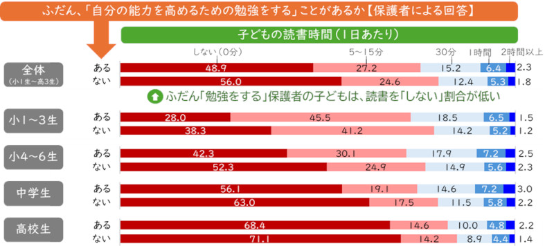 また、保護者への調査で、読書をしない子どものうち、自分の能力を高めるための勉強をすることが「ある」と答えた保護者の子どもは48.9%だったのに対して、「ない」と答えた保護者の子どもは56.0%だった。保護者の日常的な学びに対する姿勢と子どもの読書時間に関連がみられた。