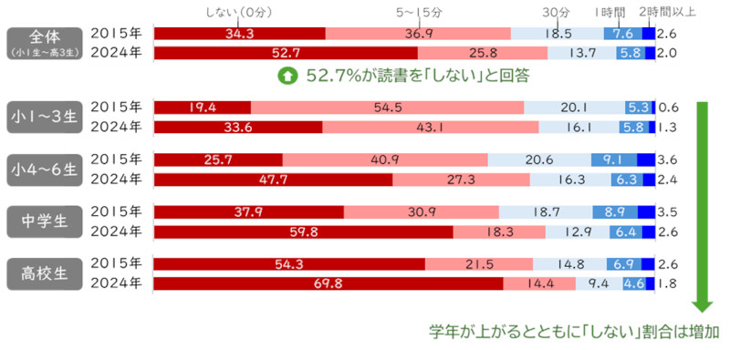 小学生から高校生までで、1日の中で読書を「しない」(0分)という子どもは52.7%と半数を超え、10年前と比べて1.5倍に増加した。今回の調査では読書に「電子書籍を含む」としたが、いずれの学校段階でも読書時間は減少傾向にある。
