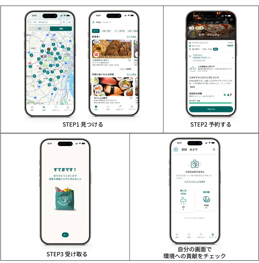 利用方法はシンプルで、専用アプリで近くの店舗を探してサプライズバッグを予約購入(アプリ内で事前決済)し、指定の時間に店頭で画面を提示して受け取るだけ。また日本限定の機能として、駅名検索機能が搭載されており、仕事帰りや外出先での利用にも配慮されている。