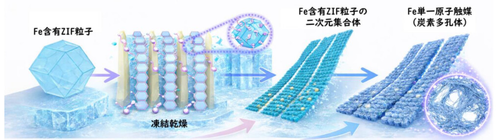 研究チームは、昨年のノーベル化学賞で話題となった多孔性材料「MOF(金属有機構造体)」を前駆体として活用。界面活性剤を含む溶液を凍らせる「凍結鋳型法」により、粒子を薄い二次元状に並べる独自手法を開発した。さらに熱処理によって、金属原子を固まりにせず炭素中に固定。内部に適度な大きさの孔を持つ構造をつくり、酸素や電子がスムーズに行き来できるようにした。