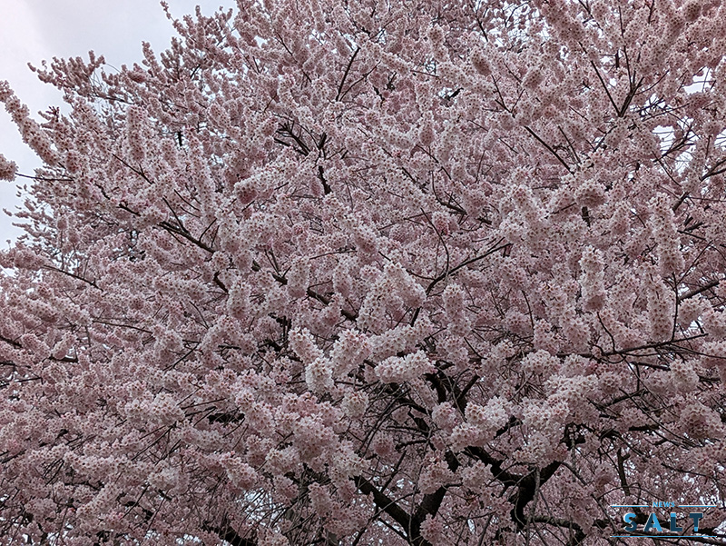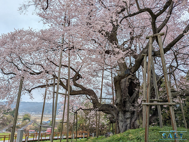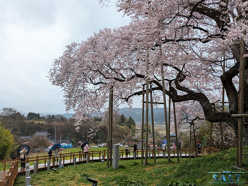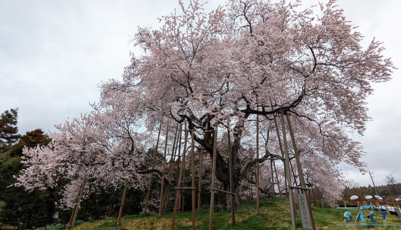 矢祭町は県内では雪の少ない地域のため、毎年福島県でもっとも早く桜が咲き、その指標として戸津辺の桜が取り上げられることが多い。樹高が18メートルにもなるエドヒガンザクラで、福島県指定天然記念物となっている。31日は平日で雨と風が強い日にも関わらず、朝からひっきりなしに見物客が訪れていた。今週いっぱいは楽しめそう。