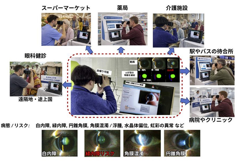 白内障や緑内障などは、早く見つけて治療すれば視力の低下を防げる場合が多い。しかし、診断には大型で高価な装置と専門の医師が必要で、地方や高齢者施設では十分な検査を受けられないことも多かった。