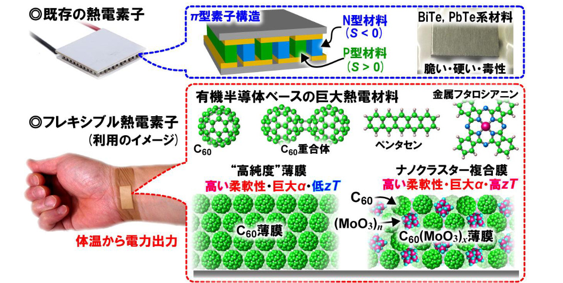 人体装着型センサー用電源として、体温を利用して発電する「熱電素子」の研究が進められている。熱電素子は、皮膚に触れた部分と外気との温度差から電気を生み出す。実用化には、柔らかくて軽く、十分な発電性能を持つ材料が必要である。従来からある室温付近で利用可能な熱電材料は、無機半導体などの硬くてもろく有害な元素を含むものが多かった。