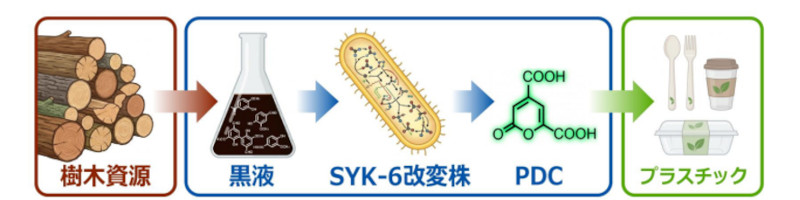 長岡技術科学大学などの研究チームは、リグニンを分解できる細菌「SYK-6株」を改良し、廃液中のさまざまな化合物を一つの物質にまとめて変換する仕組みを開発。その結果、プラスチックの原料となる化合物「PDC」を高効率で生産することに成功した。針葉樹(スギ)由来の廃液では、理論上の量を上回る135%の収率を達成し、未同定の成分も含めて有効に利用できている可能性が示された。